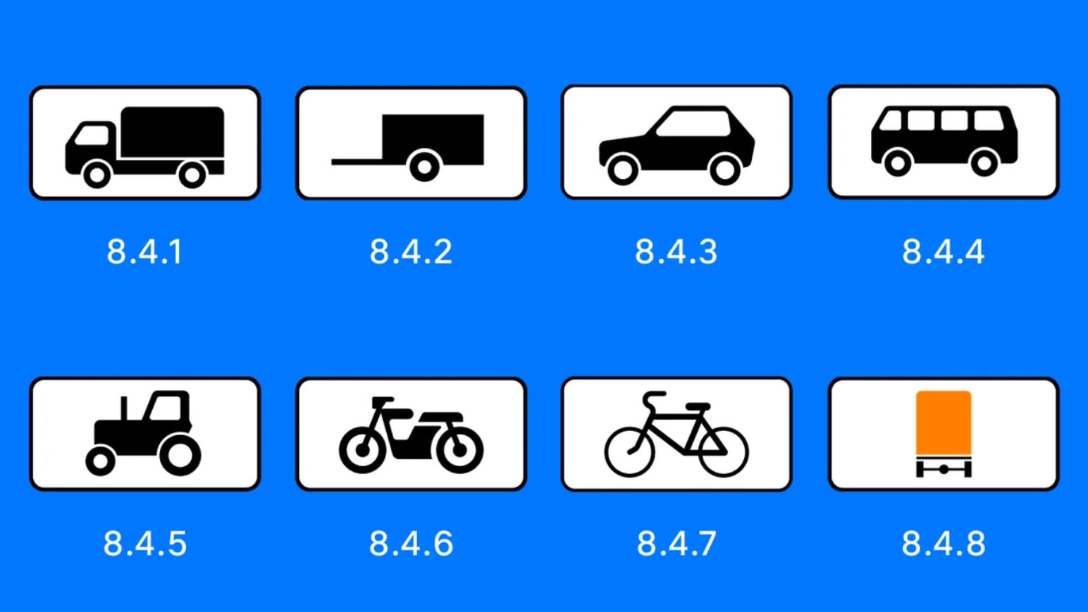 - Обратная ситуация: пояснительная табличка 8.4.1 - 8.4.8. «Вид транспортного средства». Она означает, что въезд на территорию или полосу движения запрещен данному конкретному виду транспорта (все остальные могут проезжать).